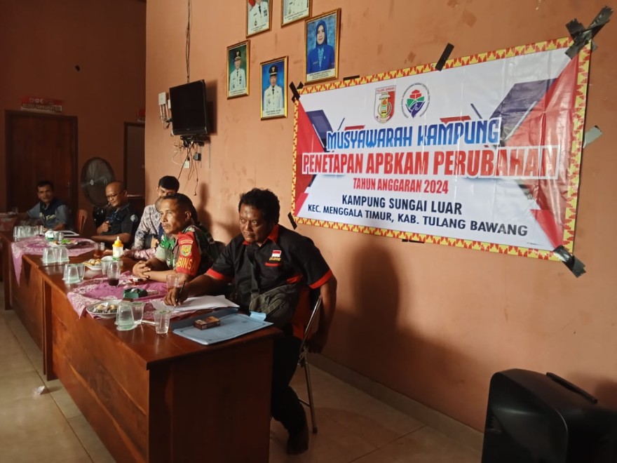 Jum'at, 02 Agustus 2024 bertempat di Balai Kampung Sungai Luar telah diadakan Musyawarah Kampung Penetapan APBKam Perubahan tahun anggaran 2024, yang dihadiri oleh Kepala Kampung Sungai Luar, Pendamping Desa, Banbinsa, BPK, RT, RW tokoh masyarakat , tokoh agama, PKK, Kader Posyandu, KPM, Kader Lansia, Karang Taruna berserta Aparatur Kampung